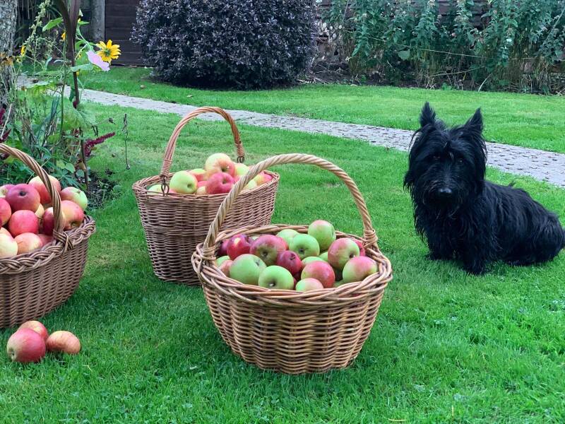 There are several types of apples on our regenerative smallholding. We planted them over 30 years ago. The trees are loaded with apples and lots have already fallen to the ground. The most prolific ones are the Bramley apple, the Katies, and the Blenheim Orange. We've gathered up some baskets full from the ground and already started the ferment process for around 10 litres of our own organic apple cider vinegar. It'll take a few months before it's ready. Watch this space and we'll let you know when we have a video of it over on our youtube channel.