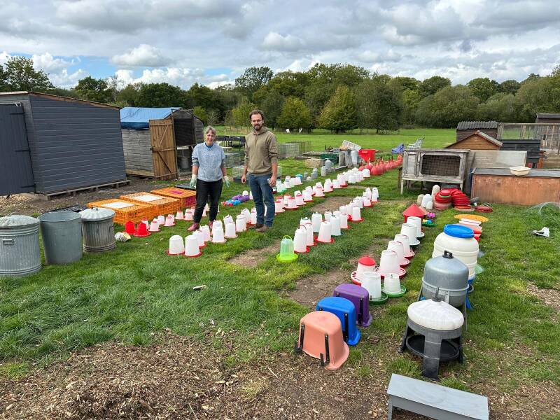 Our oldest son is doing his second poultry online auction. I've lost count but there must be around 300 drinkers and feeders, a dozen cages, half a dozen chicken transportation crates, and wait for it... is it around 2000 hens, cockerels and turkeys? Big job organising this one, and mum and dad are roped in. I've never helped clean so many drinkers and feeders in one go :)